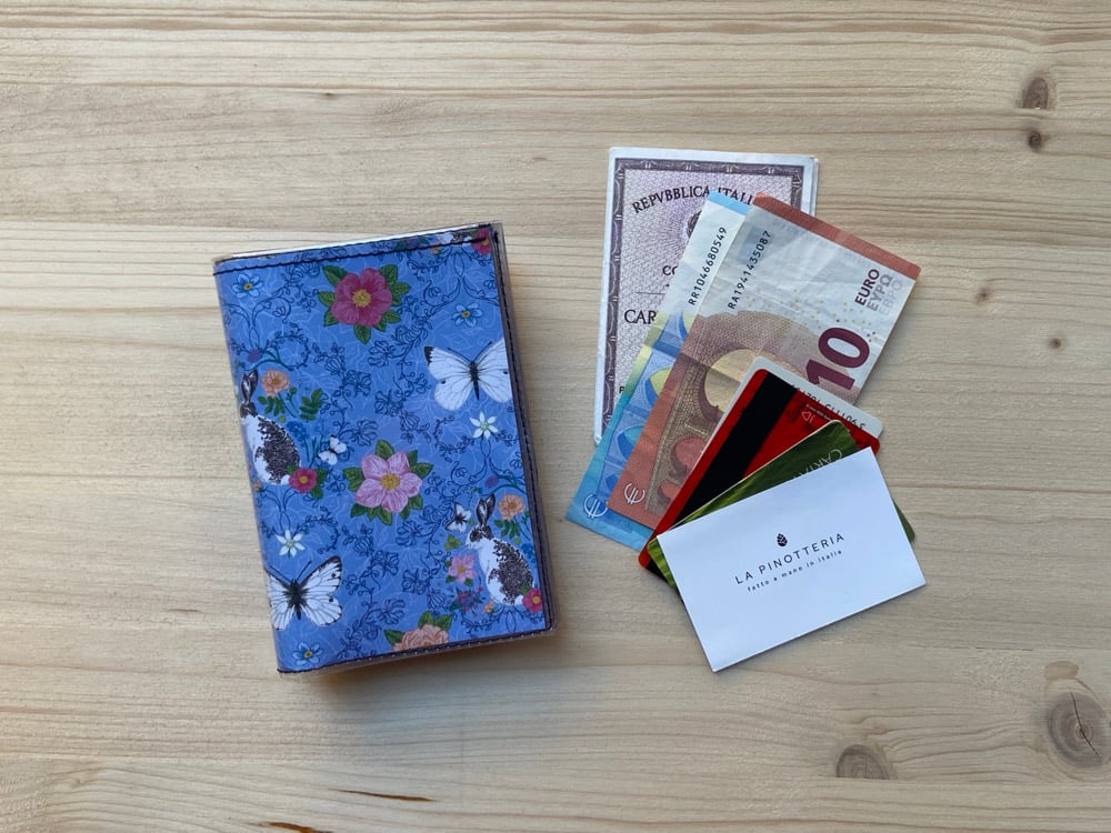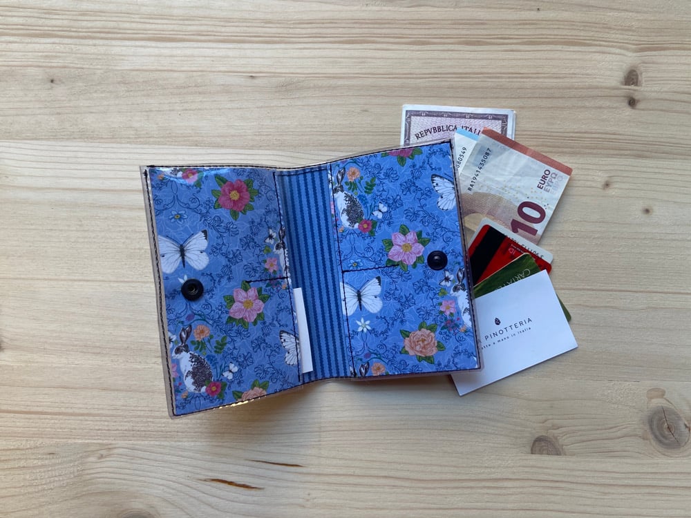 Nelle tasche laterali invece ci stanno comodamente i documenti più vecchi formato standard e una decina di tessere. Il bottone automatico interno chiude il portafogli e non si nota dall’esterno. Sul retro, come in tutti gli altri modelli de La Pinotteria, il portamonete a bustina che si può staccare a piacimento.